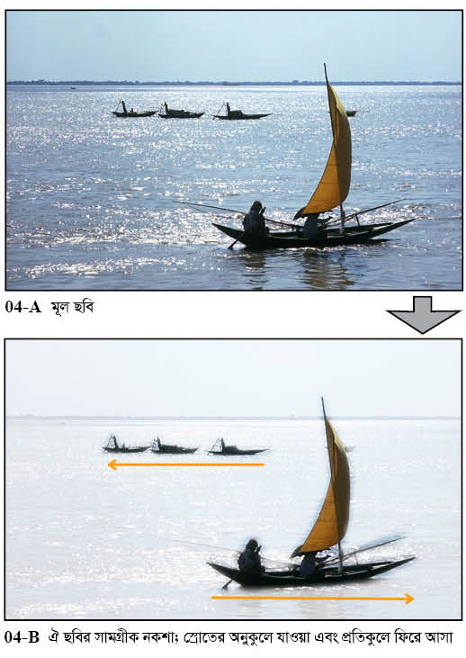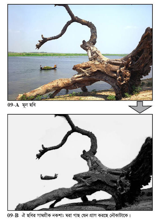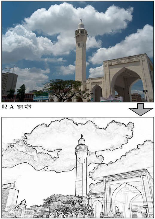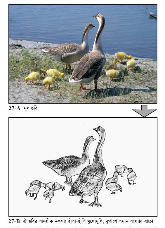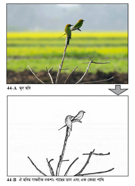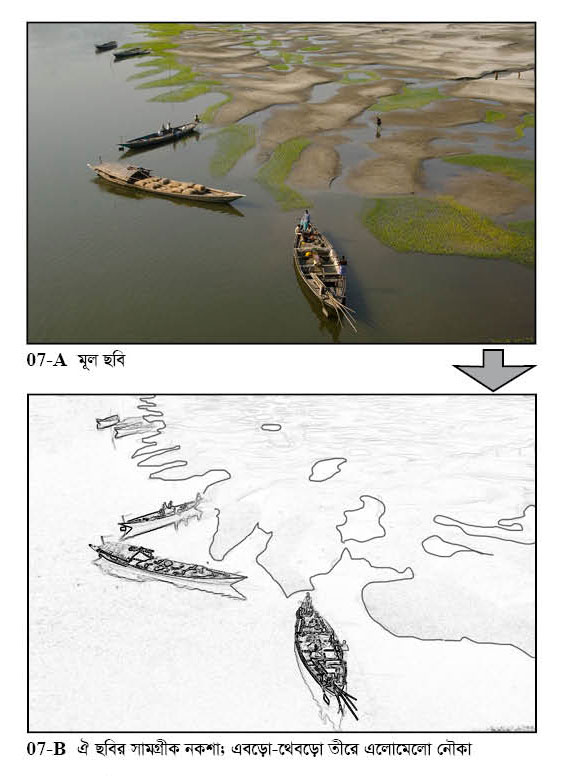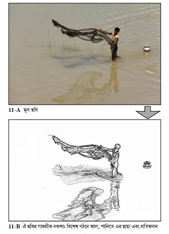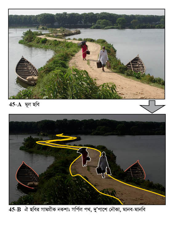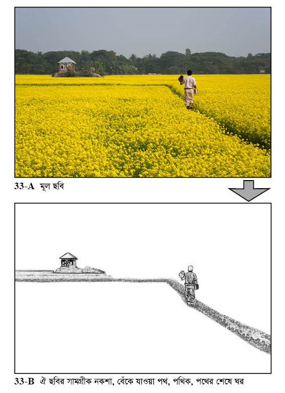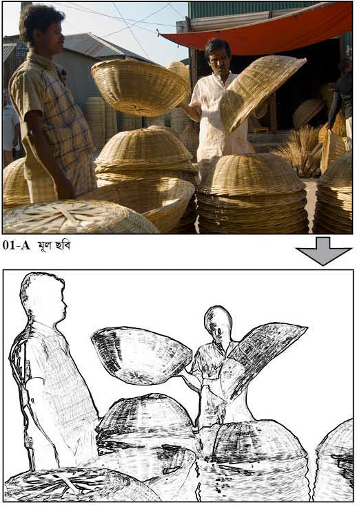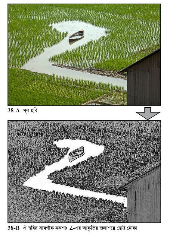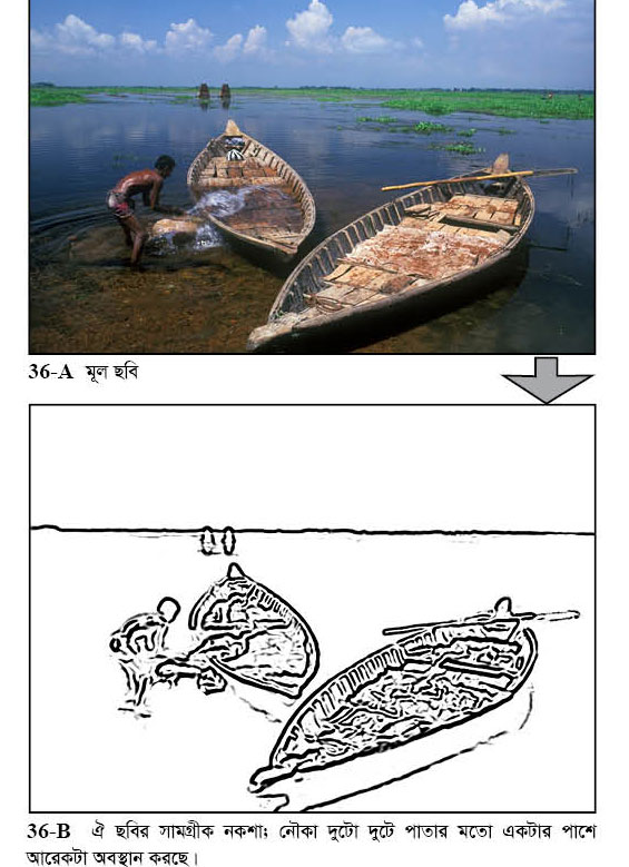 পৃষ্ঠা ০৪ থেকে নমুনা ছবিগুলোর মাধ্যমে এরই বর্ণনা দিতে যাচ্ছি । এখানে বামের ছবি (A) হল মূল ছবি। পরের একটি/দুটি (B/C) ছবি বা নকশা দিয়ে ছবির সামগ্রিক নকশা বোঝানোর চেষ্টা করেছি।