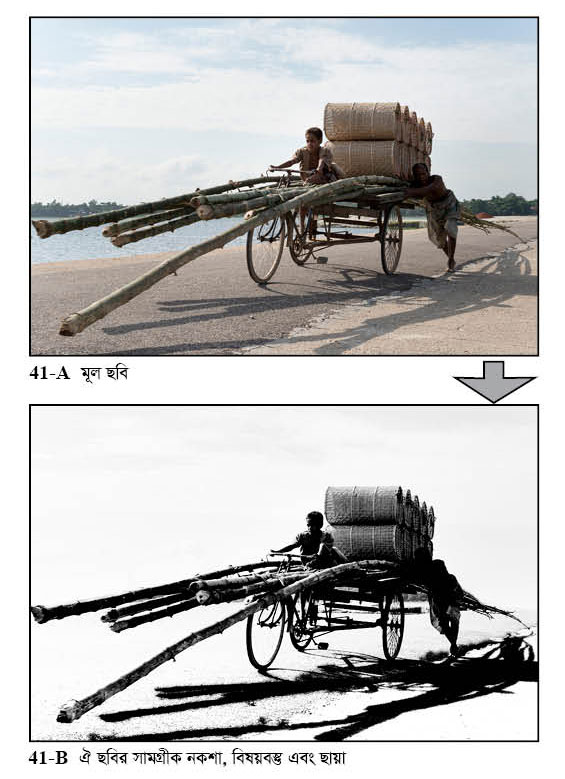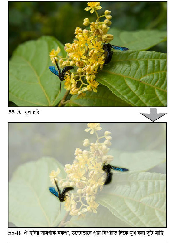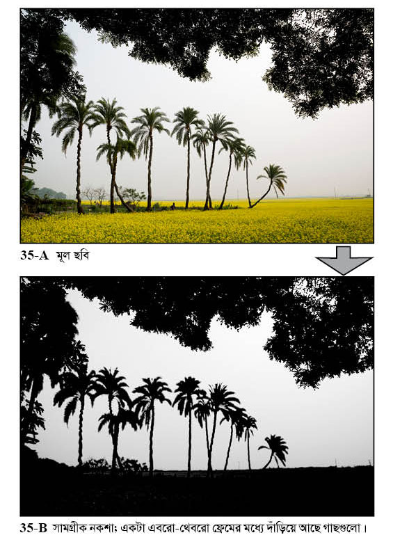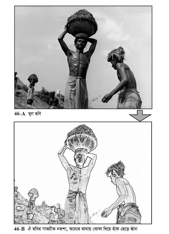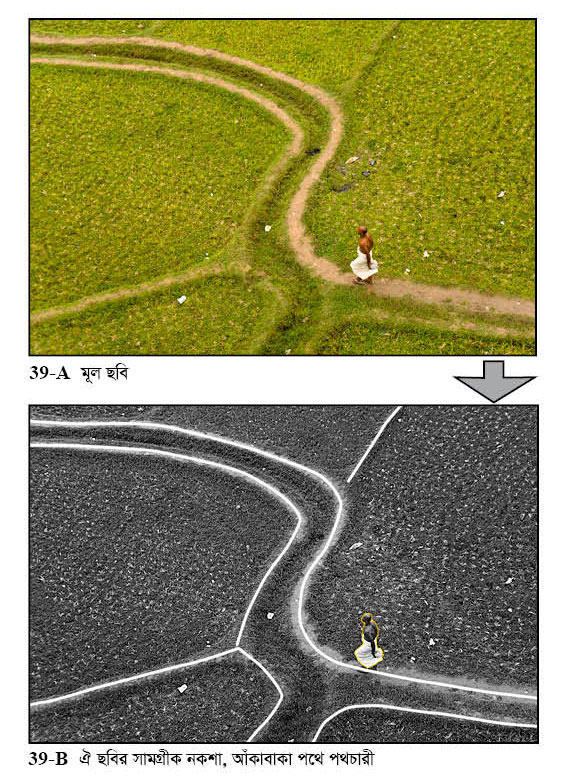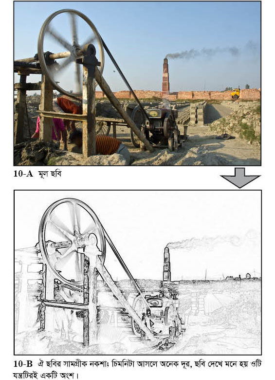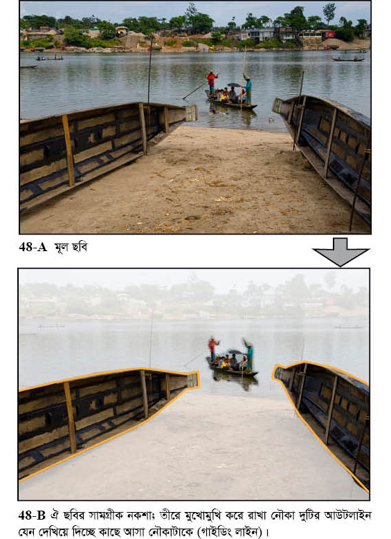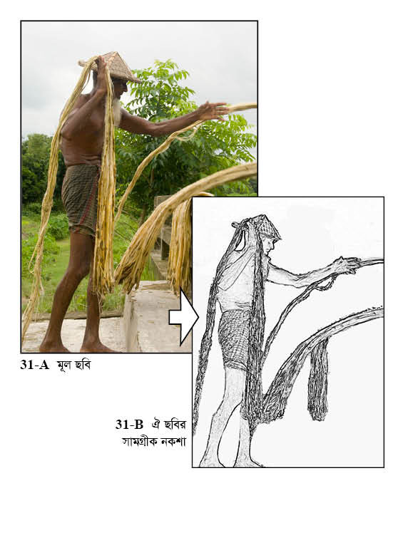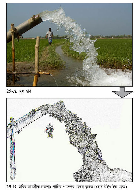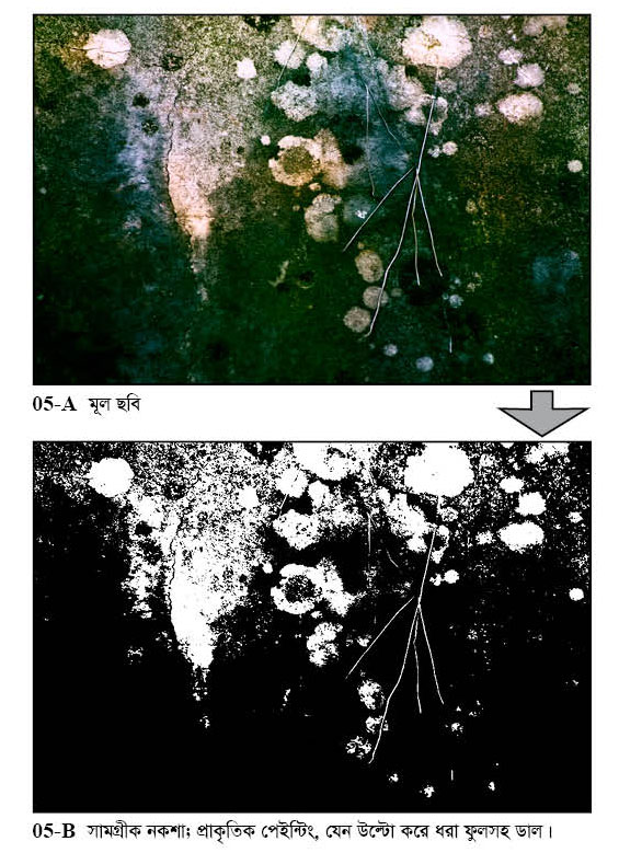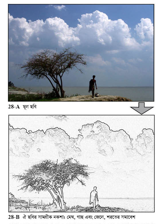 পৃষ্ঠা ০৪ থেকে নমুনা ছবিগুলোর মাধ্যমে এরই বর্ণনা দিতে যাচ্ছি । এখানে বামের ছবি (A) হল মূল ছবি। পরের একটি/দুটি (B/C) ছবি বা নকশা দিয়ে ছবির সামগ্রিক নকশা বোঝানোর চেষ্টা করেছি।